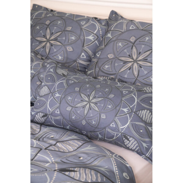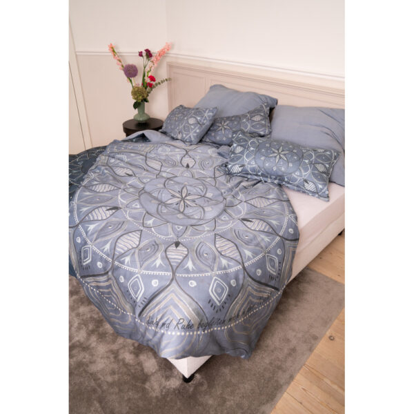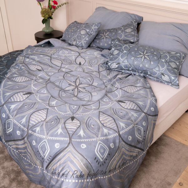 Wende-Bettwäsche „Blue Heaven“ mit „Same oder Saat des Lebens“ (Vorstufe der Blume des Lebens) und anderen Symbolen von “The Spirit of OM“, verschiedene Bett- und Kissenbezüge, Farbe: indiblau, grau, 2. Seite (Bezug und Kissen) uni blau/grau, eine Seite kühlend glatt, 2. Seite wärmend Biber-Qualität